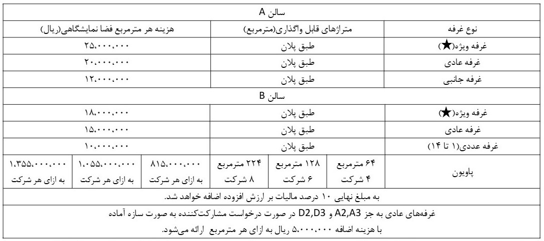 برای غرفهها با تعهد پارتیشنبندی: نصب کتیبه، موکت، دو عدد صندلی فایبر گلس تاشو و یک عدد میز گرد ام دی اف و برای هر غرفه 12 تا 16 مترمربع، روشنایی متعارف، خروجی تک فاز در حد مصرف متعارف |